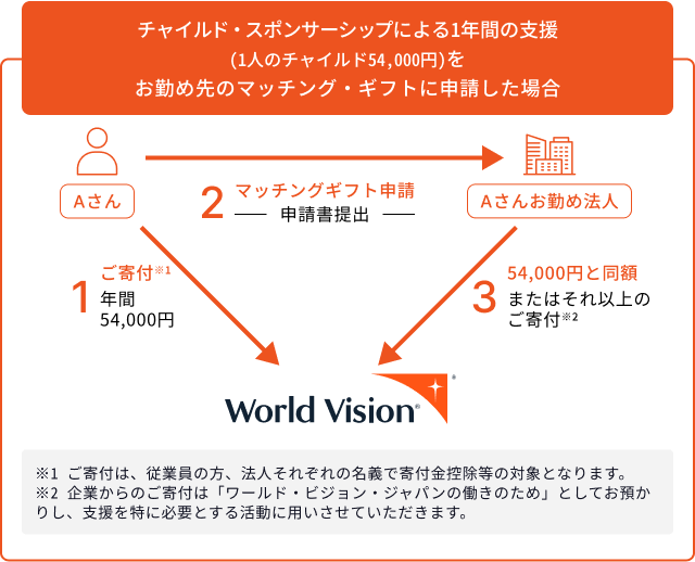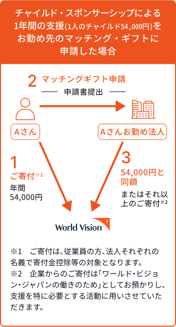 たとえばチャイルド・スポンサーシップによる1年間の支援(1人のチャイルド54,000円)の場合、企業からもワールド・ビジョン・ジャパンに同額(またはそれ以上)をご寄付いただくことになります。各種募金での受付も可能です。