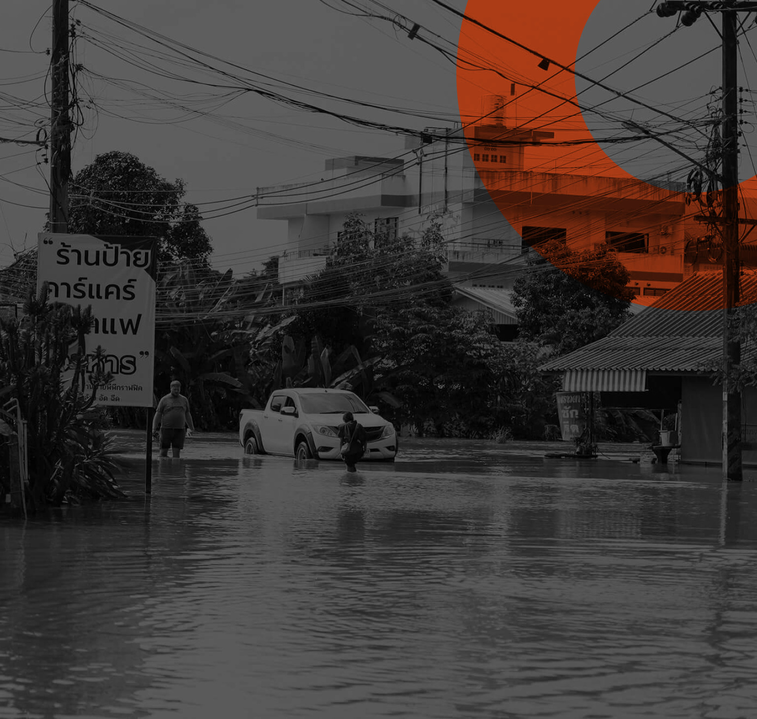 浸水した道路で車から物資を下ろし配付するスタッフたち。洪水被害への緊急人道支援で地域の生活を守る。