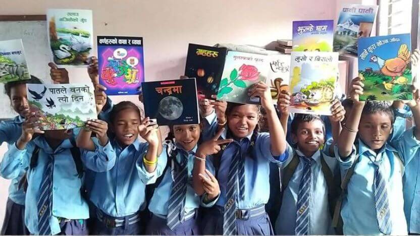 ワールド・ビジョンの教育支援の一環として、教材を贈られたネパールの子どもたち