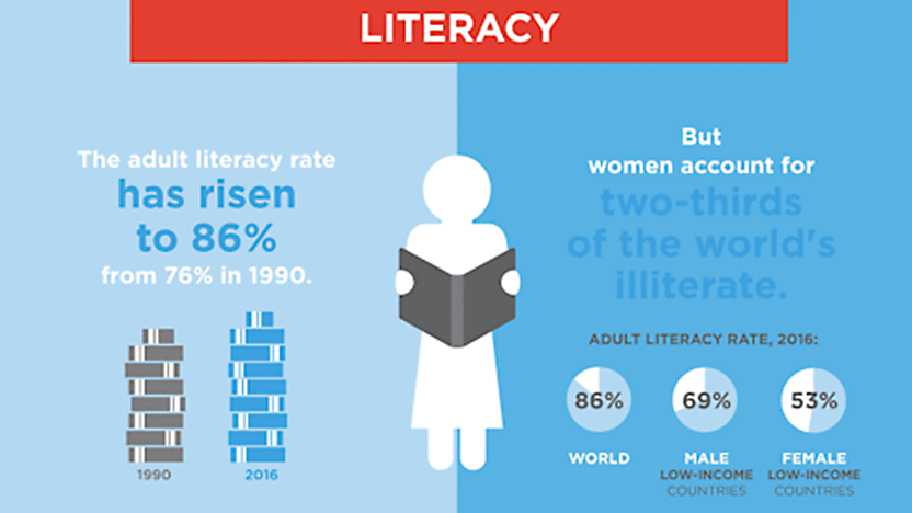 上図は、女性の識字率を表したデータです。2016年時点での識字率は、世界平均で86%ですが、低所得国の女性に限っては53%しかありません。