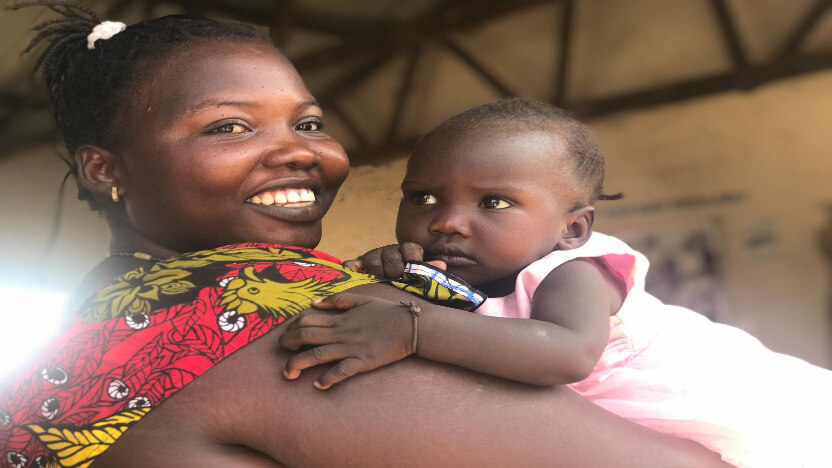南スーダン難民危機により大学に通うことが難しくなってしまった、 生後9カ月の娘を抱く女性
