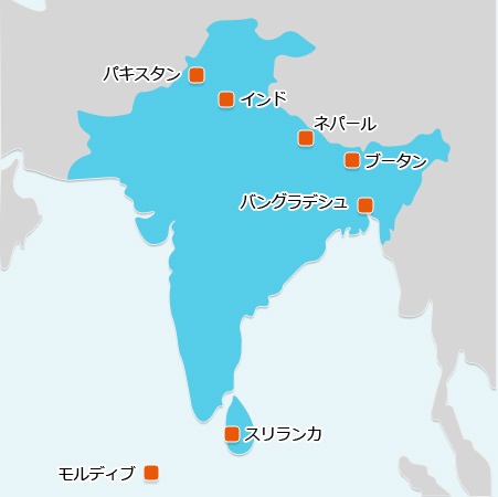 南アジアはその中のひとつで、インド、パキスタン、バングラデシュ、スリランカ、ネパール、ブータン、モルディブの7カ国で構成されています(注2)。