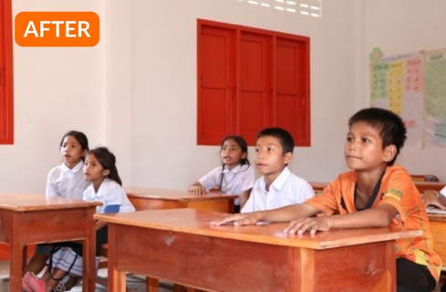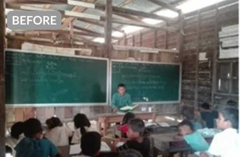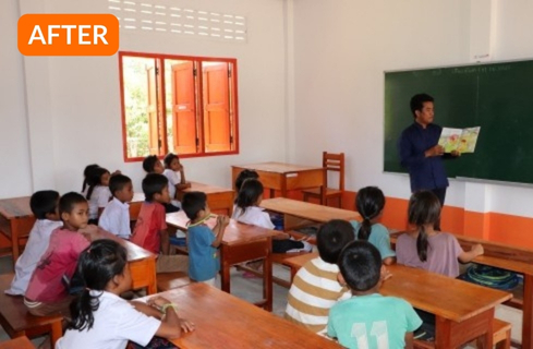 「旧校舎では雨のときや、暑い時期には授業をするのが困難でした。子どもたちは授業に集中しづらく、学校を休みがちでした。今年度は例年よりずっと多くの子どもたちが学校に来ています。教育支援事業で学んだ楽しい授業の教え方や、供与された教材を使って教えていることもあいまってか、子どもたちはよく集中して授業に参加しています