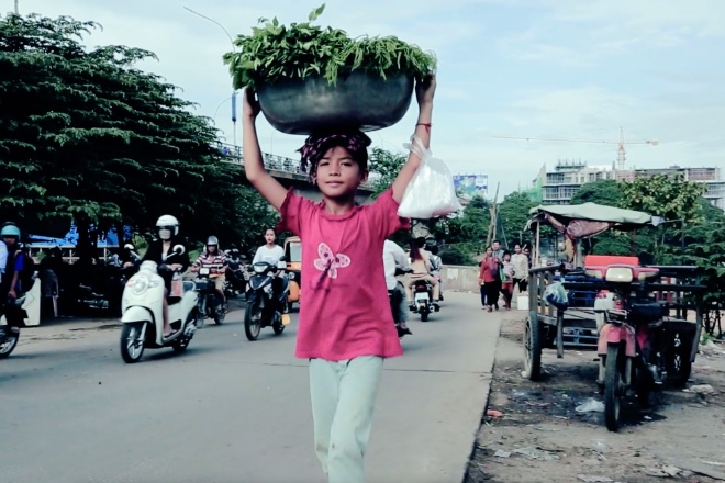 たくさんのバイクや車が行き交う中、こぼれ落ちそうなほどの量の野菜が入った大きなタライを頭に乗せて、市場へと歩いて向かいます。10歳の少女の細い腕では、支えるだけで精いっぱいの様子でした。