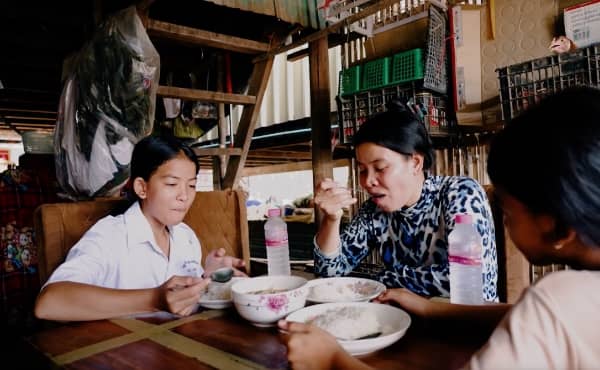 教育以外にもさまざまな面でチャイルド・スポンサーによる支援を受けて生活が大きく改善したソクナちゃん。朝も、家族でゆっくりと朝食を取れるようになり、3食お腹いっぱい食べられるようになりました。