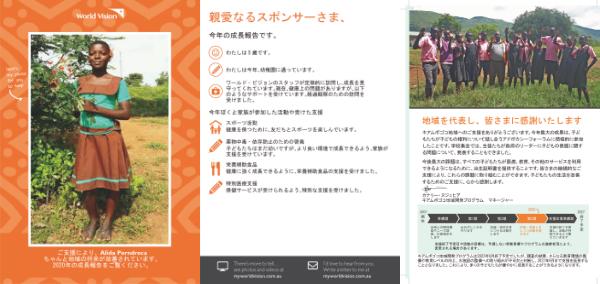 チャイルドの成長報告をお届けします。成長報告には、身長や体重だけでなく、健康状態、就学状況、家族の情報、コミュニティ支援の報告なども載っており、自分の子どものように成長を実感することができます。