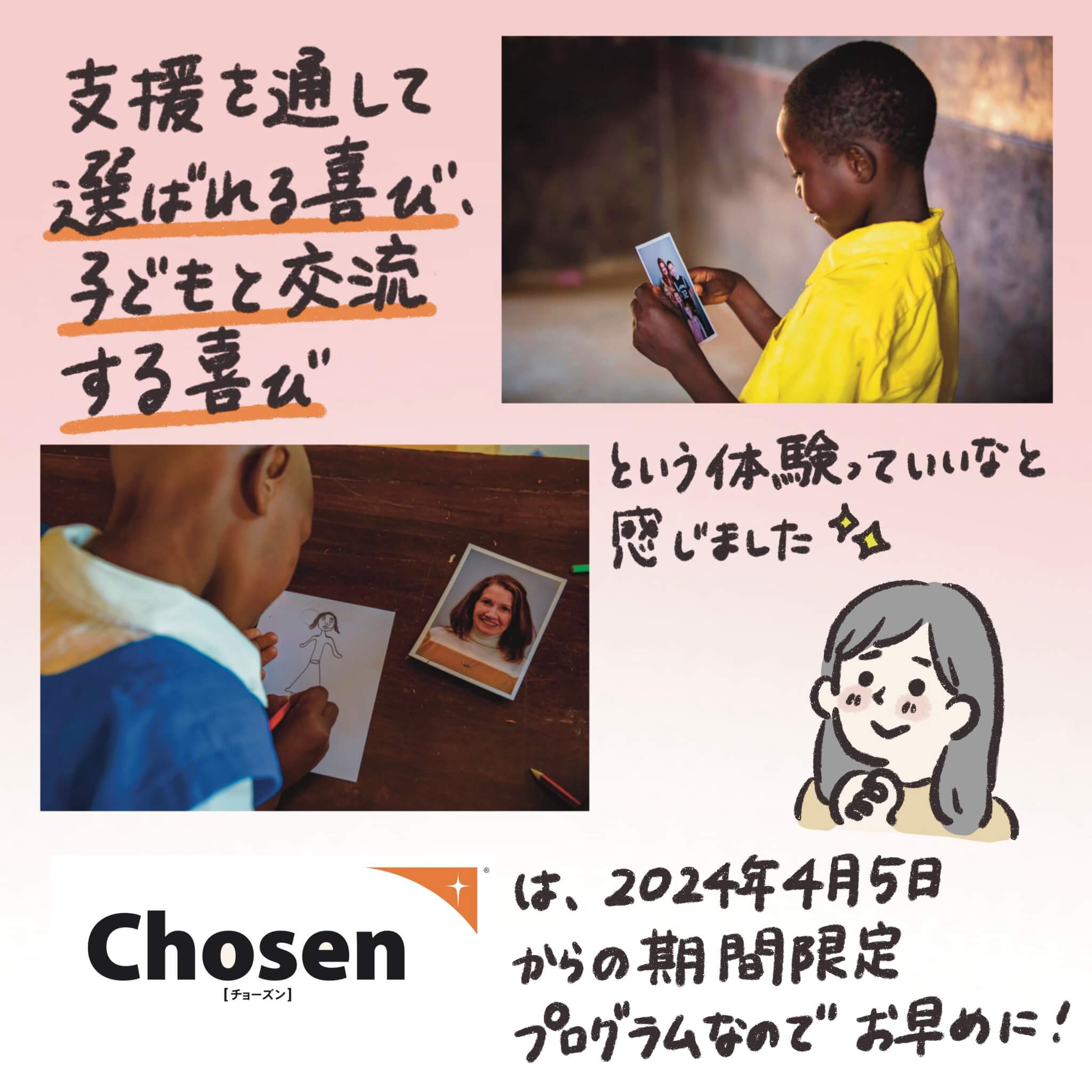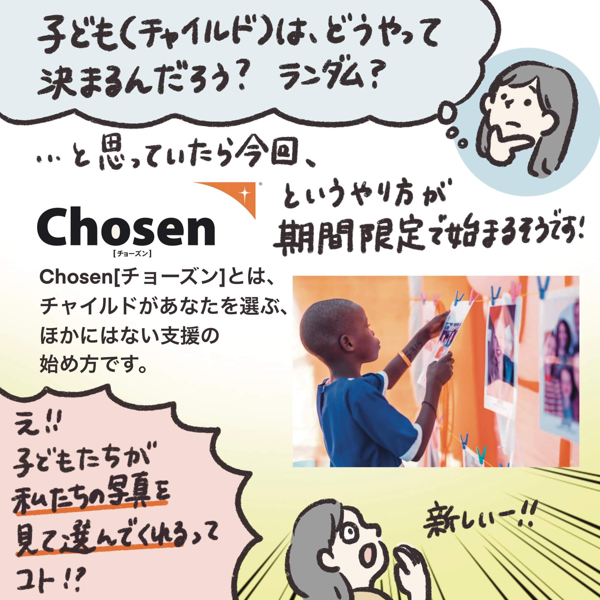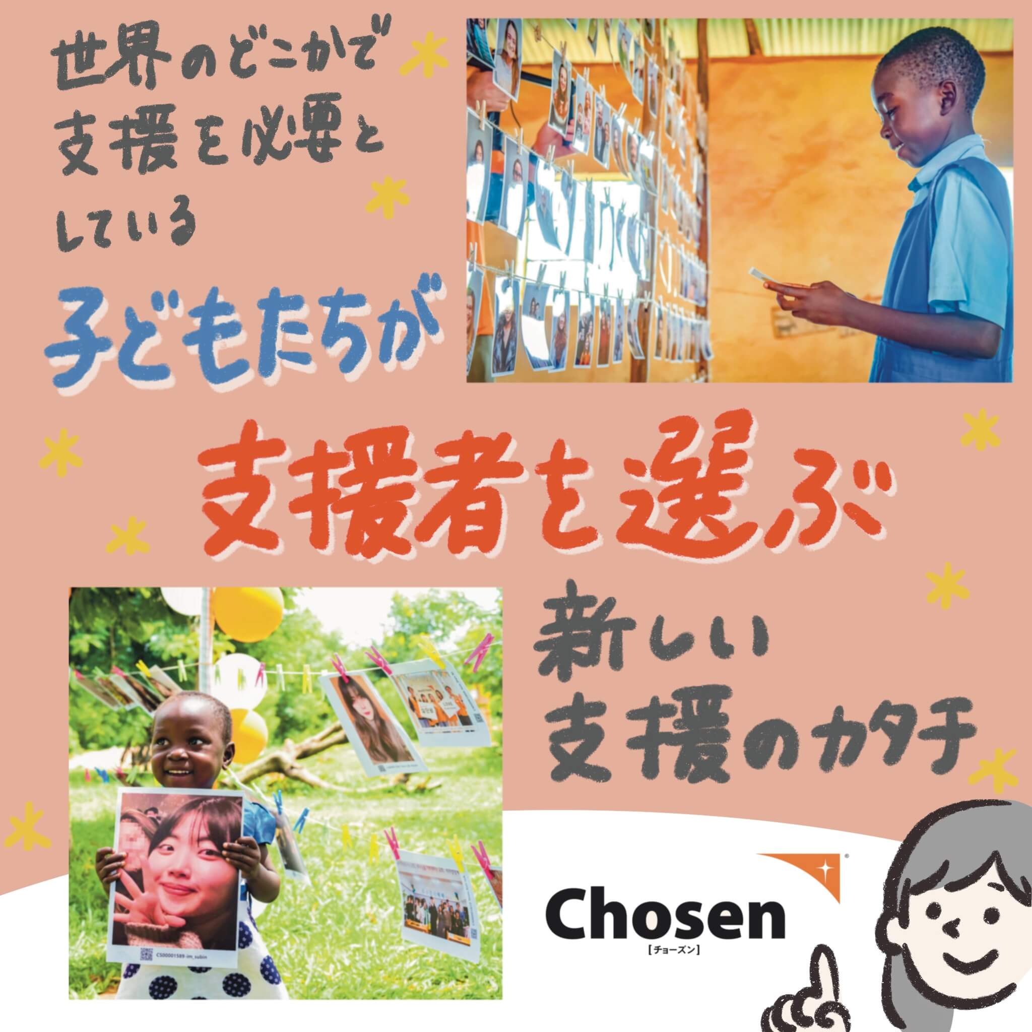 Chosenは、チャイルドがあなたを選ぶ、チャイルド・スポンサーシップのもう一つの支援の始め方。チャイルドが自分の支援者(チャイルド・スポンサー)を写真から選びます。