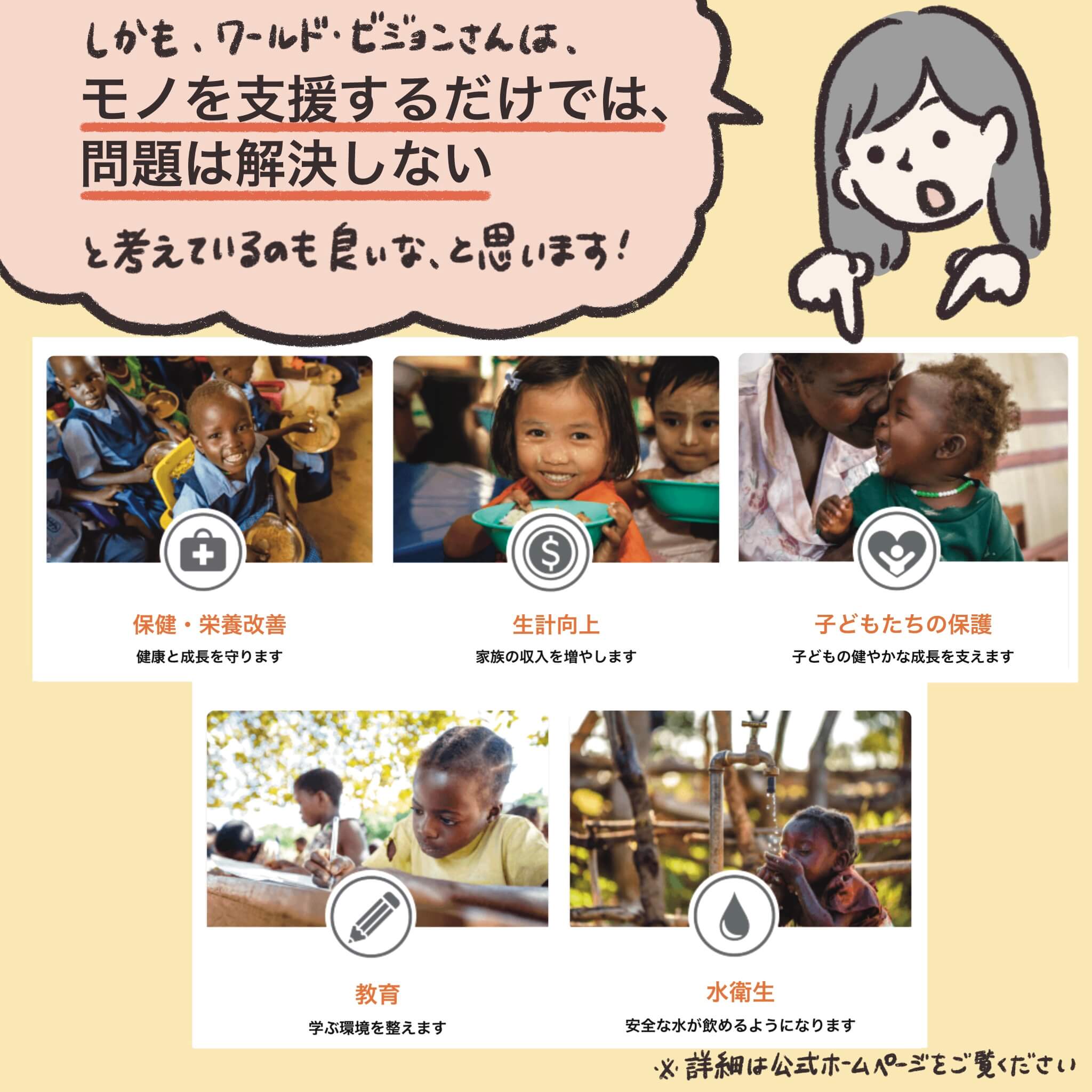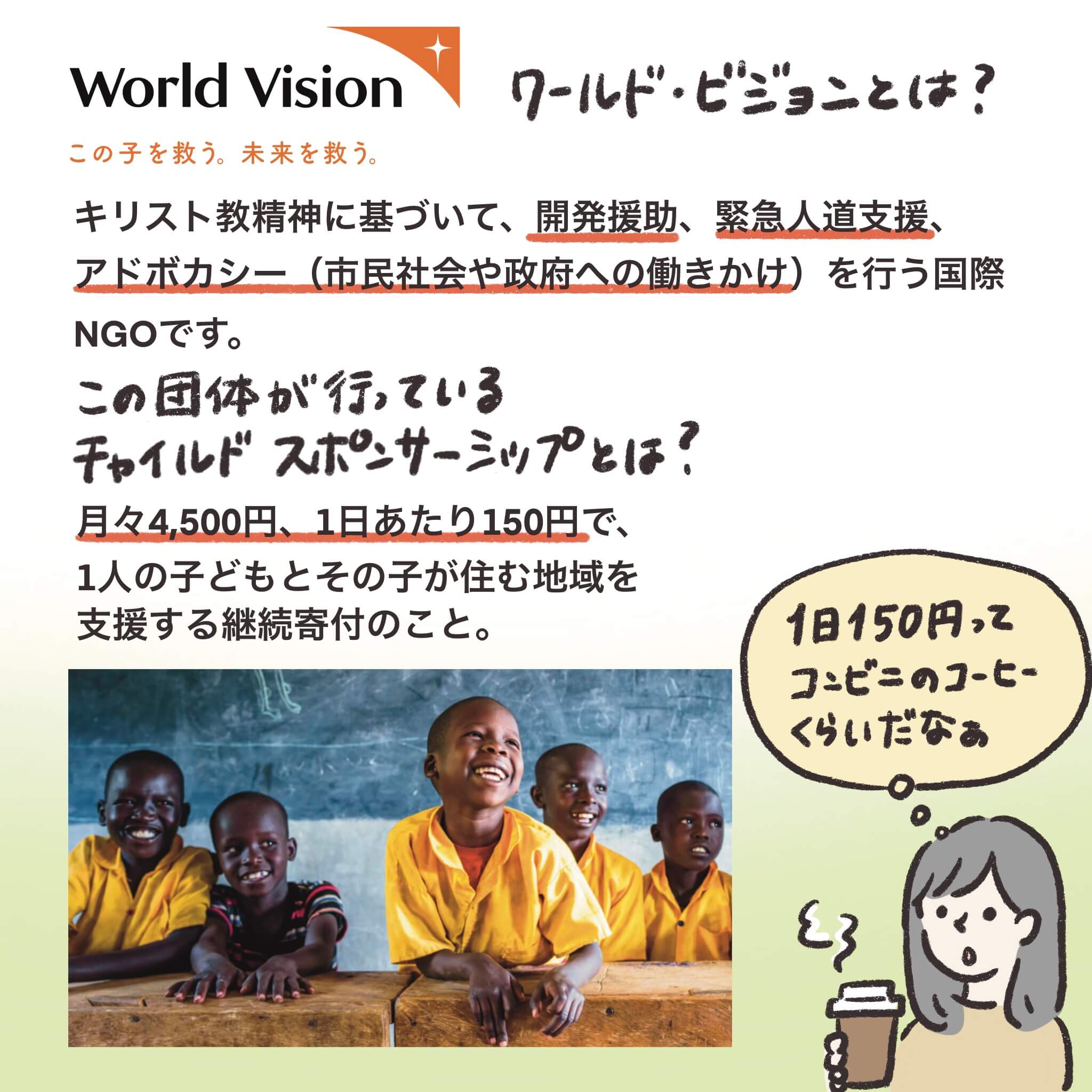 1日あたり150円、月々4,500円の継続支援で、⼦どもたちが貧困から抜け出し、
