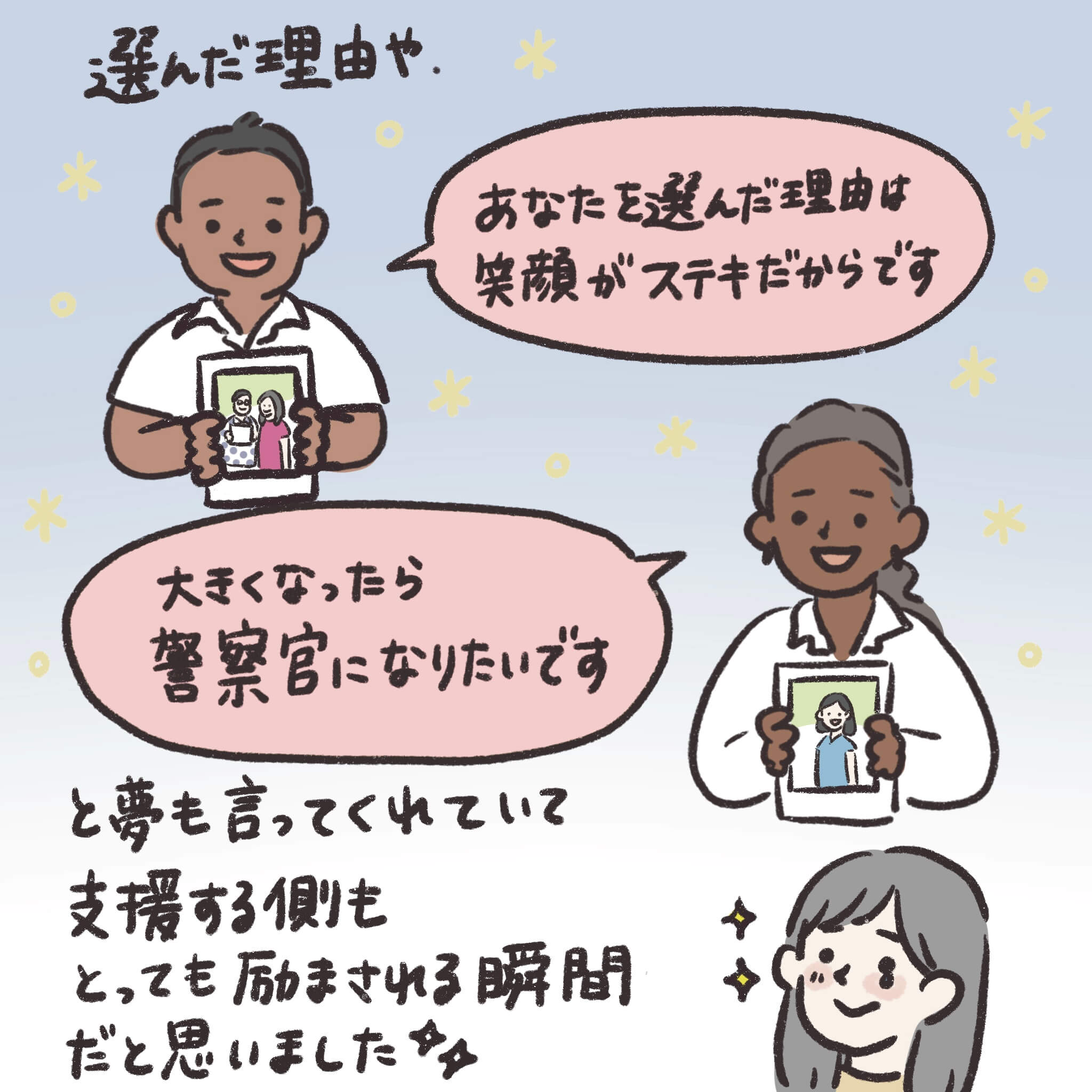 チャイルドがスポンサーを選ぶ理由は一人ひとり違います。どんなチャイルドが、どんな理由で選んでくれるのか、楽しみにお待ちください。