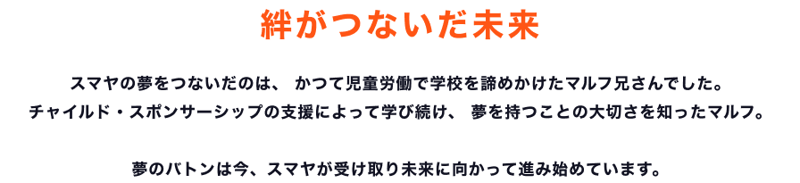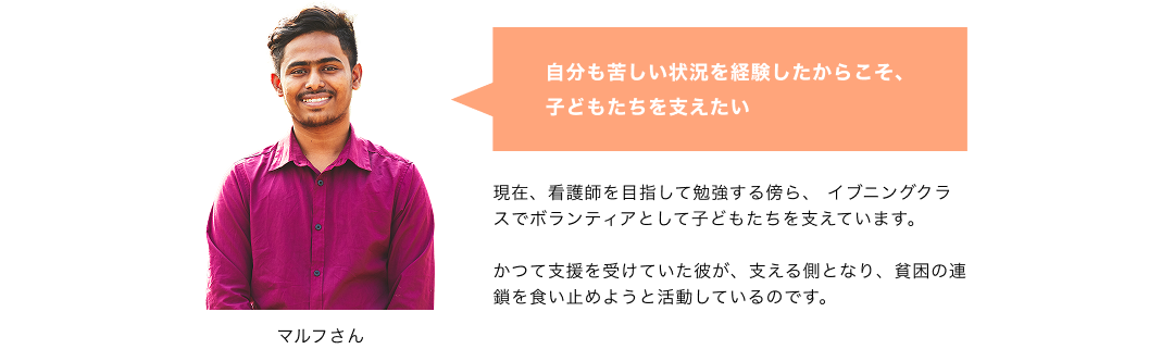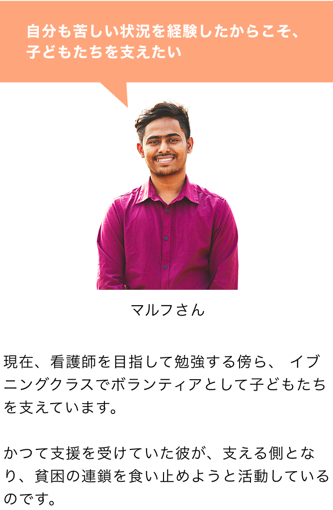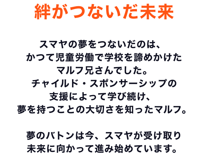 実はマルフ自身も、かつては過酷な環境に身を置いていました。 両親を亡くし、学校を辞めざるを得ない状況に陥りましたが、 チャイルド・スポンサーシップの支援を受け、学び続けることができました。