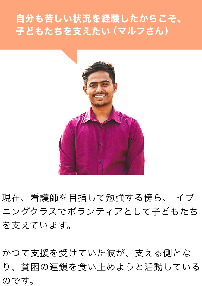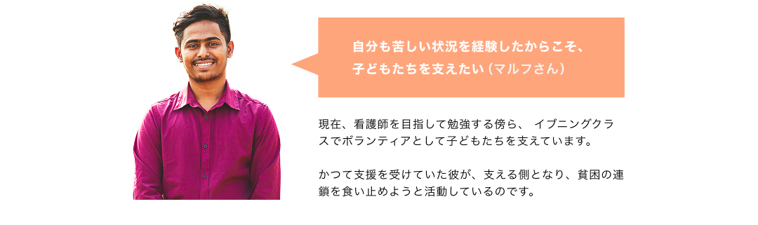 実はマルフ自身も、かつては過酷な環境に身を置いていました。 両親を亡くし、学校を辞めざるを得ない状況に陥りましたが、 チャイルド・スポンサーシップの支援を受け、学び続けることができました。