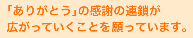 何でもいいから誰かのためになることをしてみる。自分の時間、経験、お金を自分以外の人のために注ぎ、その対価として「ありがとう」の想いが返ってくる。そんな感謝の連鎖が広がっていくことを願っています。