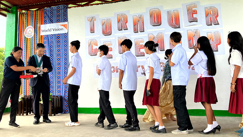2 月 16 日(金)に開催された式典には、生徒や教師、保護者、コミュニティ関係者のほか、WVJ と WV のフィリピン事務所であるワールド・ビジョン・ディベロップメント・ファンデーションからスタッフが出席しました。来賓として、ミツビシ・モーターズ・フィリピンズ・コーポレーション(以下 MMPC)副社長の宇佐美 雄久様、サンタリタ市教育委員会や政府教育省サマール管轄学校部門担当者をお迎えし、新しい校舎の完成をお祝いするとともに、子どもたちの学習環境の改善につながる支援を喜びました。中等学校のビオレッタ校長は、 「校舎建設の支援は、学習環境の整備になるだけでなく、子どもたちにとって大きな自信と励みになります。教育は力であり、夢に近づく原動力になります」と述べました。