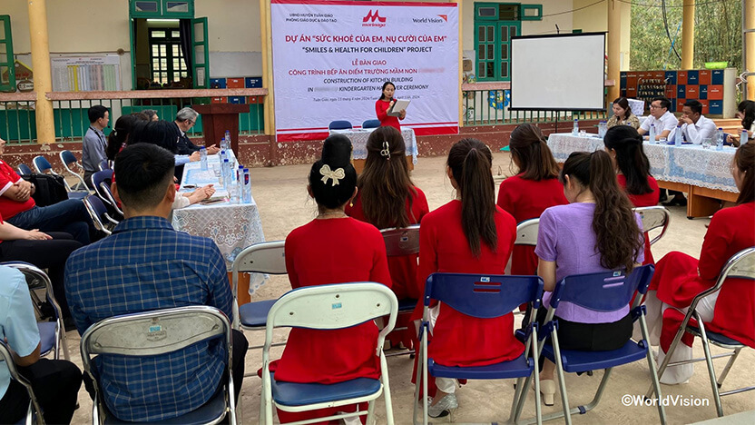 世界の子どもを支援する国際NGOワールド・ビジョン・ジャパン(事務局:東京都中野区、事務局長:木内真理子/WVJ)は、森永乳業株式会社(森永乳業)が2023年6月に開始したベトナムの子どもたちの健康を応援する「Smiles & Health for Children」に協力し、ベトナム国ディエンビエン省トアンザオ郡において、子どもたちの健康・栄養状態の改善に向けて、対象の幼稚園において、給食提供の基盤整備と、教員や保健スタッフのスキル強化を進めています。2024年4月11日、森永乳業グループの社員が参列し、幼稚園給食調理施設の引き渡し式が開催されました。