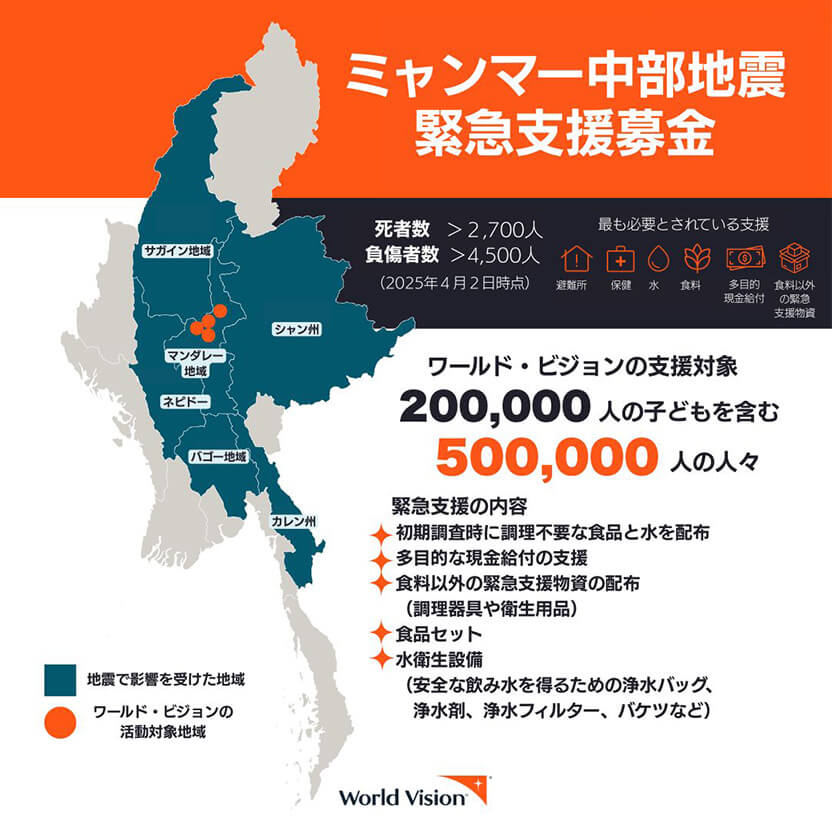 ワールド・ビジョンは、マンダレー地域で最も大きな被害を受けた地区の緊急アセスメントを開始し、調査と並行して、食料、清潔な水、マットや毛布、衣類や衛生用品など命をつなぐために必要な緊急支援物資の配布を進めています。さらに、被災した子どもたちとその家族が、医療、衛生施設、心理社会的支援を受けられるよう活動しています。